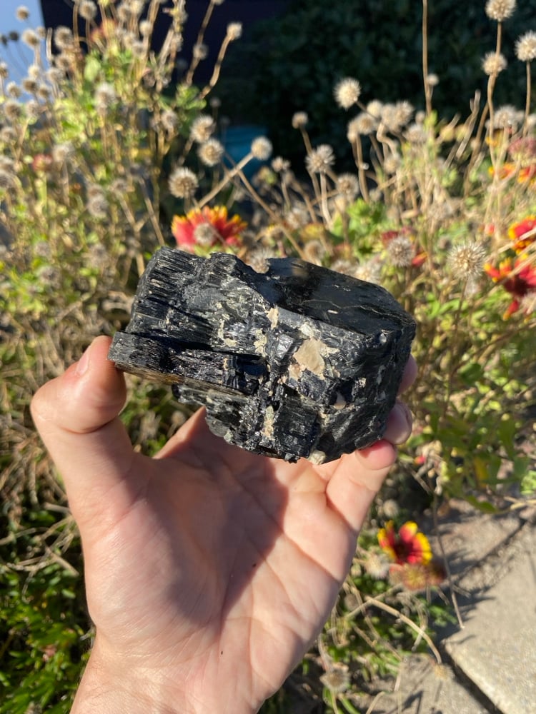 Biotite also known as "black mica" or "iron mica" is a common mica mineral with a characteristic dark color and ability to split into thin sheets, this specimen formed uniquely in a hexagonal shape with some pretty apatite and feldspar inclusions